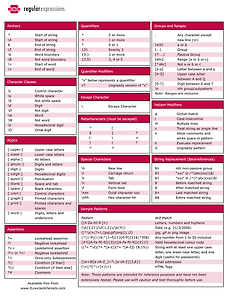 Linux - vi편집기 사용법 2014.12.20 Regular Expressions Cheat_sheet 2014.12.27 SQL - 가장 많이 사용되는 SQL명령어 2016.02.25 Python - Starting guide [from install to hello world] Using Anaconda 2018.05.26 Vi - NERDTree 사용법 2019.01.11 [Python] Dart 재무재표 분석 _ [1] Dart에서 고유번호 불러오기 2021.08.20 Regular Expressions Cheat_sheet Regular Expressions Cheat_sheet Example: KOREAN[가-힣] - 완성형[ㄱ-ㅎ] - 자음[ㅏ-ㅣ] - 모음[ㄱ-힣] - 전체 CHINESS[一-龥] URL LINK(https?:\/\/)?(www\.)([\w-]+\.)+[\w-]+(/[\w-./?%&=]*)? DATE(\d{1,2}\/\d{1,2}\/\d{4}) IMAGE jpg, gif, png ...([^\s]+(?=\.(jpg | gif | png))\.\2) EMAIL(\w+@[a-zA-Z0-9_]+?\.[a-zA-Z]{2, 6}) HTML tag(\]+)\>)한 쌍의 태그 선택(특정 HTML 태그)(\]+[\>])([^])([^ 2014.12.27